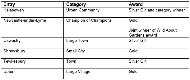 Shrewsbury and Oswestry have both triumphed at this year’s RHS Britain in Bloom awards.